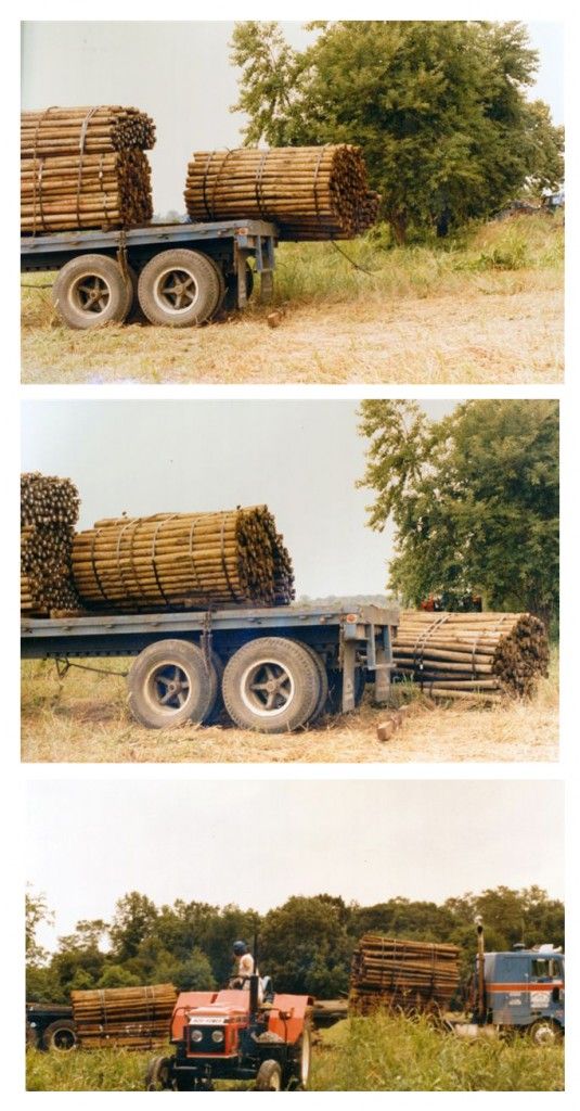 The posts did finally arrive in June on two huge trailers. Unloading the bundles of posts proved there is always another way to skin a cat. Not having a forklift on location, the driver of the truck told me to take a long chain, attach it to the tractor, and pull the bundles straight off the flat bed trailers.