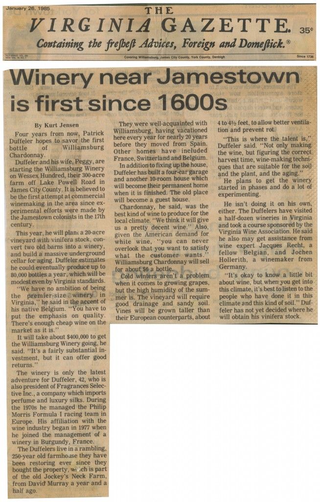 We were encouraged by the coverage we had received in the local press and by some local enthusiasts, though there were still a number of people who looked at us with a quizzical look. Reading their minds, I thought I was hearing “A winery in Williamsburg? Is this for real?”